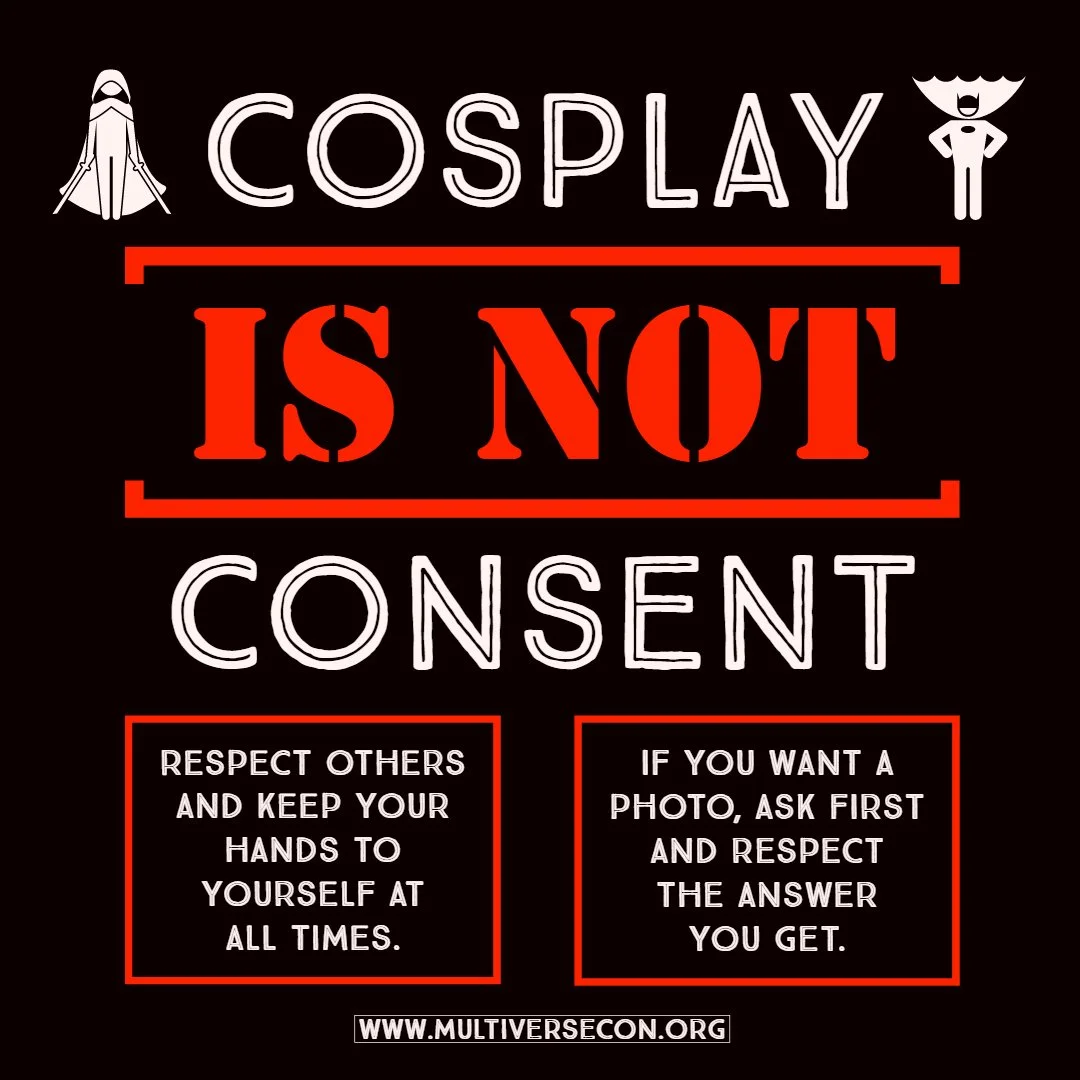 COSTUMING IS NOT CONSENT! You will probably see some really cool costumes at Multiverse, some of which may be a bit sexy or revealing. However, a person's choice of costume DOES NOT give anyone else license to touch, comment, ogle, or treat them any differently without the cosplayer's clearly expressed, unambiguous consent. The Multiverse Code of Conduct applies to all people at Multiverse at all times, no matter what they're wearing.